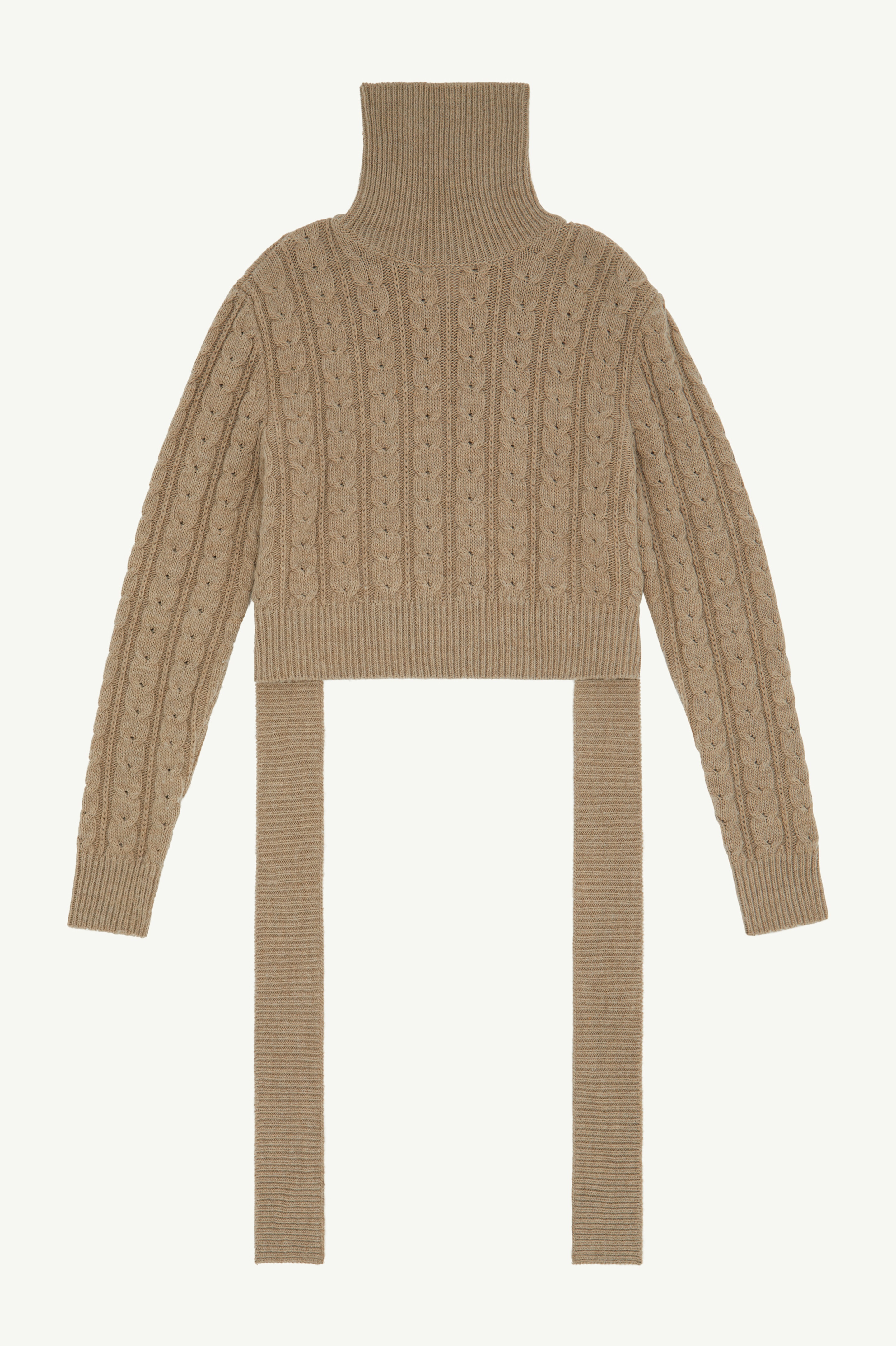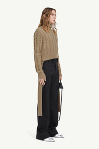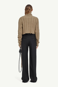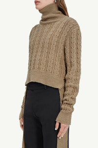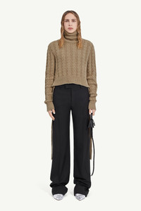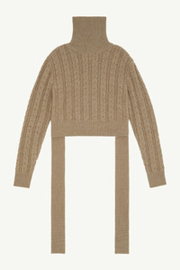 Virgin wool roll neck jumper with classic cable stitch, disrupted by its sliced appearance with the raw edges hemline and its slice rib ties around the waist. Ribbed neck and cuffs complete the design. MM6’s discreet yet distinct signature, a horizontal line of white stitches, is found on the back of the garment. Gauge 5. Product Details Item ID S62HA0082S18385110 Composition: 50% virgin wool, 50% acetate Wool pullover Gauge 5 Raw hem Ribbed neck and cuffs Sliced rib to tie around the waist White stitch line at the back Made in Italy