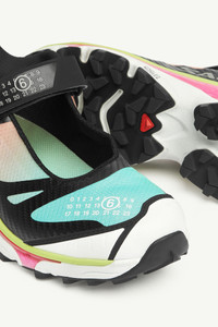 The MM6 x Salomon collaboration speaks to the brands’ shared ethos of transitional design, first seen in the Maison’s Autumn/Winter 2022 show. Drawing inspiration from the everyday, the collection is a celebration of the unsung beauty of quotidian dressing; of the eclectic blur of clothes that pass us by on our city streets. This season, MM6 introduces a Mary Jane hybrid sneaker maintaining Salomon's technical performance and functionality. The style is crafted from recyclable polyester and features and adjustable strap with MM6's numeric signature on it. Product Details Item ID S66WS0102P7010HA454 Upper: 100% polyester Contrast: 100% polyurethane Lining: 100% polyester Inside: 100% polyester Sole: 100% rubber Mary jane shoes in recycled polyester Adjustable strap with MM6 numeric signature