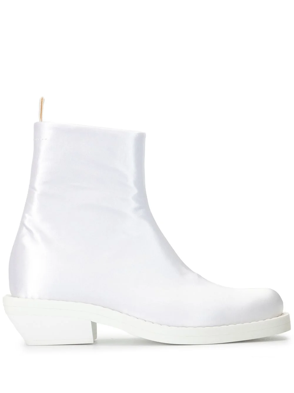 satin ankle boots Shine as you step into the new season a la MM6 Maison Margiela. In white, these ankle boots boast a satin finish. It's all about the sheen. Highlights - White - Satin - Almond toe - Side zip fastening - Leather lining - Pull tab at the heel - Low block heel Made in Italy Composition Sole: Calf Leather 100% Lining: Leather 100% Outer: Satin 100% SIZE & FIT Measurement CIRCUMFERENCE 8.66 in(22 cm) HEEL 2.16 in(5.5 cm) HEIGHT 6.29 in(16 cm)