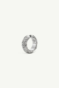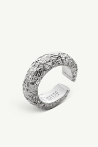 An ear cuff crafted in silver-toned brass with a crinkled foil finish. The irregular surface captures light with a sculptural intensity, transforming a utilitarian shape into a futuristic object. The Maison's engraved numeric artwork is concealed on the interior, grounding the piece in MM6’s subversive detail. Product Details Item ID SM6VG0105P6622956 Body: 100% brass One size Textured brass ear cuff Silver foil finish Engraved brand logo Avoid salt, chlorine water and aggressive liquid Made in Italy