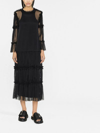 sheer long-length ruffle-trim blouse sheer long-length ruffle-trim blouse from MM6 Maison Margiela featuring black, sheer, ruffled detailing, crew neck, crop sleeves, straight hem and long length. Made in Italy Composition Polyester 89%, Spandex/Elastane 11% SIZE & FIT Model measurements Height 5 ft 10 in(1.77 m) Bust/Chest 32.67 in(83 cm) Hips 35.43 in(90 cm) Waist 23.62 in(60 cm) FittingInformation This piece fits true to size. We recommend you get your regular size Cut for a loose fit Made with a lightweight stretch fabric Washing instructions Dry Clean Only