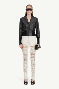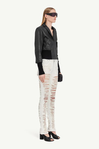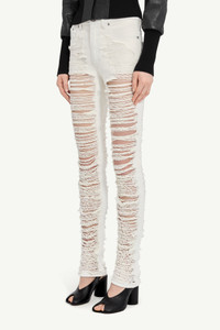 Distressed to the extreme, these close-fit jeans transform traditional denim into a canvas for disruption. The shredded detailing speaks to MM6’s deconstructive aesthetic, creating a piece that feels unfinished yet entirely deliberate – a testament to the Maison’s forward-thinking design language. Product Details Item ID S62LB0185M30018961 Primary Fabric: 100% Cotton Pocket Lining: 65% Polyester 35% Cotton Denim 5-pockets trousers Regular waist Zip and button closure Belt loops Skinny leg Distressed details White stitch line at the back Made in Italy