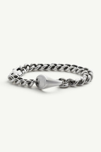 This silver-finished brass bracelet recasts the signet ring in a low-profile context. Numeric artwork at the clasp discreetly underscores the MM6 signature, while the industrial form quietly shifts a traditional emblem into contemporary territory. Product Details Item ID SM7UY0088P7356952 Body: 100% Brass Vintage silver bracelet with ring One size Engraved MM6 numeric signature on clasp Made in Italy The item comes in a white zipped bag