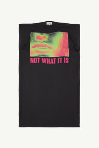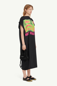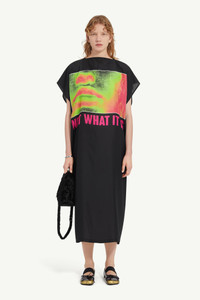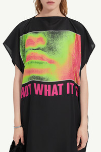 Inspired by band souvenir t-shirts and obscure musical subcultures, this printed silk midi dress features a universally flattering boat neck and short sleeves. A horizontal white stitch line at the back pays homage to MM6's signature detailing, blending abstract motifs with a modern edge. Product Details Item ID S62DG0040M35245001S Composition: 100% silk Printed silk midi dress Boat neck Short sleeves White stitch line at the back Made in Italy