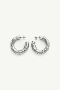 Earrings treated with a silver foil effect, creating a rippled surface that subverts the clean outline of a classic hoop. The crinkled texture amplifies tactility, turning an archetype into a sculptural accessory. Product Details Item ID SM6VG0104P6622956 Body: 100% copper Contrast: 100% brass Contrast: 100% silver One size Textured hoop earrings Pair Post back fastening Engraved brand logo Avoid salt, chlorine water and aggressive liquid Made in Italy