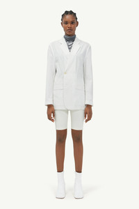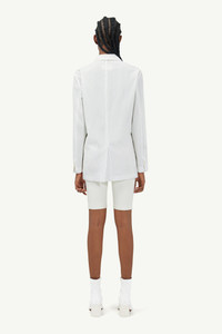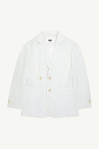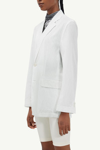 Single-breasted suit jacket cut from striped cotton poplin. The silhouette features notched lapels, flap pockets and a centre back vent that lend it timeless appeal. MM6’s discreet yet distinct signature, a horizontal white stich line, is present on the back of the jacket. Model is 182cm tall and wears size 40.