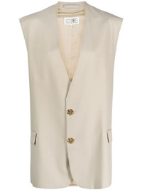 single-breasted tailored vest Highlights - Tailored-cut single-breasted vest from mm6 maison margiela featuring signature single-stitch logo, raw-cut edge, tailored cut, collarless, v-neck, front button fastening, two front flap pockets, full lining, almond beige, wool blend and sleeveless. Made in Italy Composition Outer: Polyester 55%, Wool 45% Lining: Viscose 100% SIZE & FIT Model measurements Height 5 ft 11 in(1.8 m) Bust/Chest 30.7 in(78 cm) Hips 35.03 in(89 cm) Waist 24.4 in(62 cm) FittingInformation Designed for an oversized fit, offering additional room throughout Made from a midweight non-stretch fabric This piece fits true to size – take your usual size
