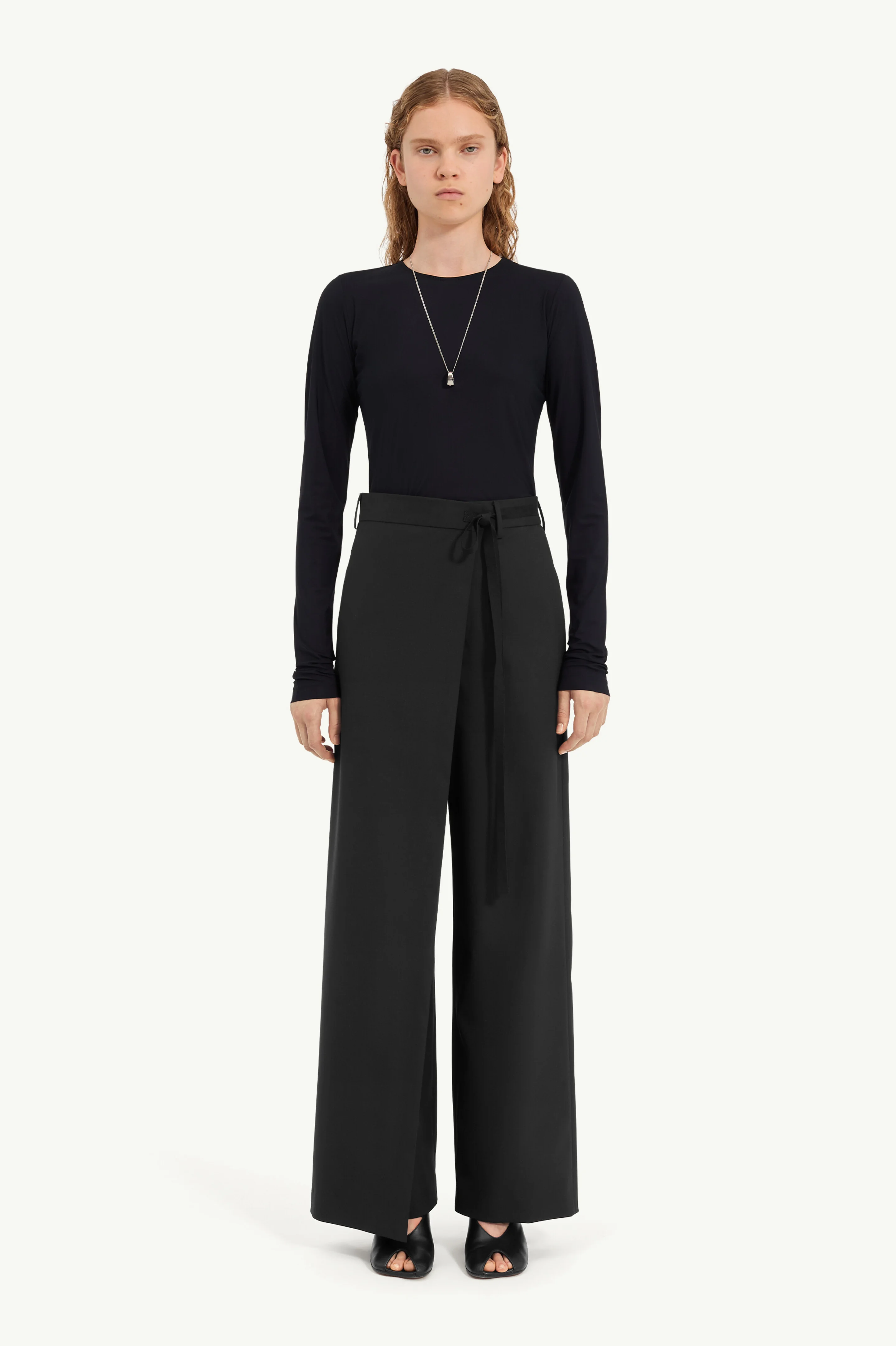 Tailored in a wool blend, these wide-leg trousers feature an attached side panel detailed with jacquard label motifs and tonal laces. The panel can be worn tied for a wrapped silhouette or left untied for a fluid, deconstructed effect. At the back, the MM6 white stitch line affirms its signature. Product Details Item ID S52KA0518M35733900 Primary fabric: 54% polyester 44% wool 2% elastane-spandex Pocket lining: 100% viscose-rayon Full-length wide-leg fit Overlay front panel with tie detail Front tie and concealed closure White stitch line at the back Made in Italy