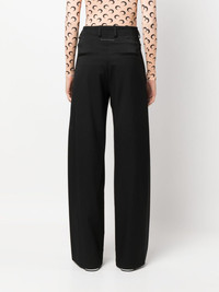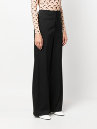 single-stitch logo wide-leg trousers Highlights - Jet black - Stretch-design - Signature single-stitch logo - High-waisted - Belt loops - Concealed front fastening - Two side slash pockets - Two rear jetted pockets - Wide leg Made in Italy Composition Outer: Polyester 54%, Virgin Wool 44%, Elastane 2% Lining: Viscose 100% SIZE & FIT Model measurements Height 5 ft 9 in(1.76 m) Bust/Chest 33.07 in(84 cm) Hips 34.64 in(88 cm) Waist 25.59 in(65 cm) FittingInformation Designed for a straight-leg fit, these trousers allow for a close fit at the waist and an unrestricted, comfortable fit over the leg Made from a midweight stretch fabric, this piece offers elasticity and flexibility when worn This piece fits true to size – take your usual size Washing instructions Dry Clean Only