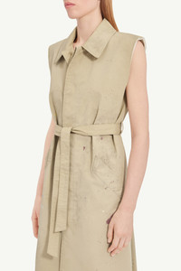 This sleeveless trench coat blurs the lines between artistry and utility. The tie waist enhances its versatile silhouette, while paint residue lends an unfinished, artisanal touch. Anchored by the MM6 white stitch line at the back, it’s a contemporary take on an enduring classic. Product Details Item ID S62FB0082S78537113 Primary Fabric: 100% Cotton Lining: 100% Cotton Cotton gabardine gilet Collared neckline with a button-down front Handpainted colour splatter Side pockets Adjustable waist White stitch line at the back Cropped Made in Italy