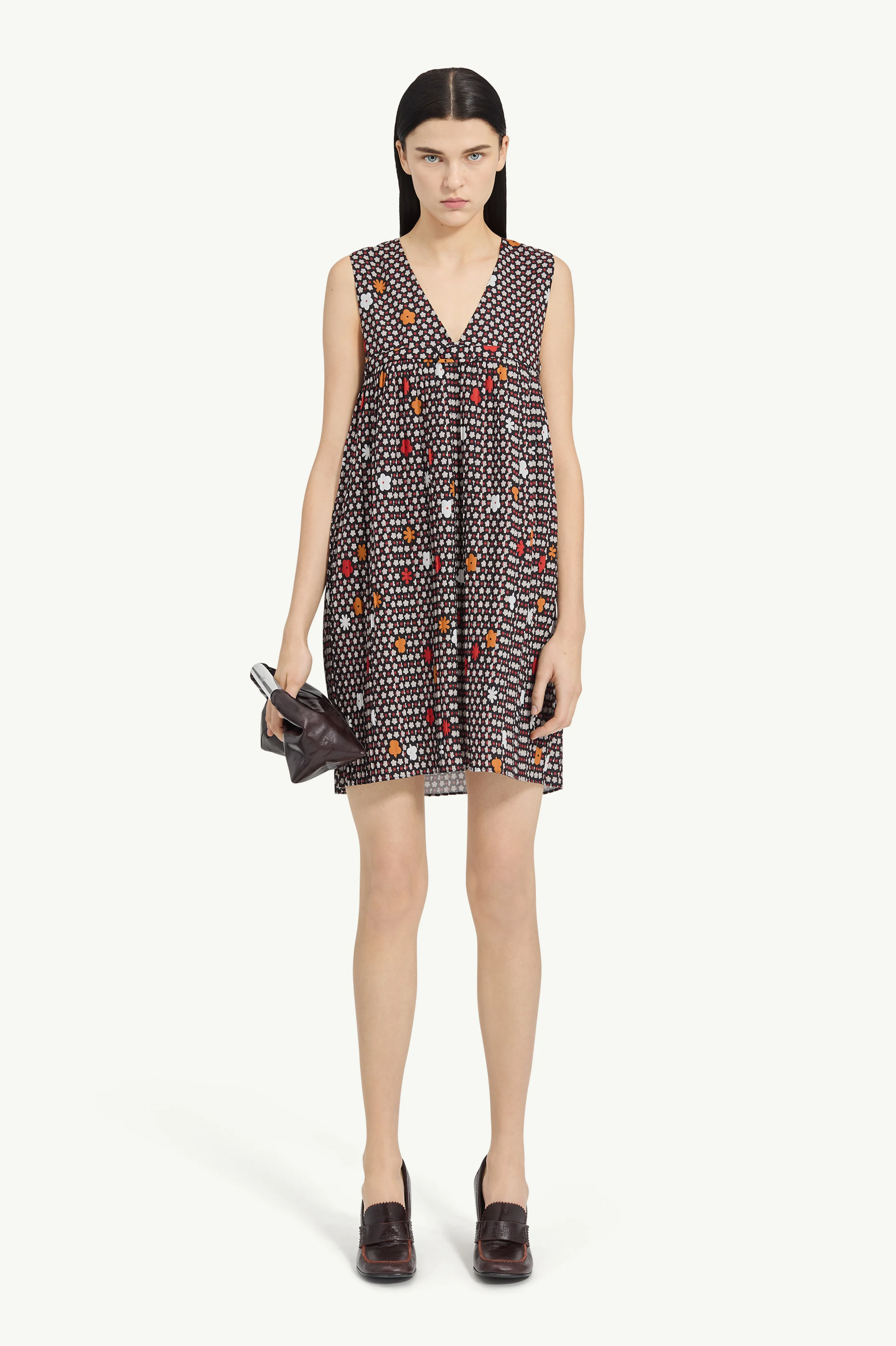 This sleeveless V-neck dress balances structure and ease through an empire seam and fluid pleating. The cut references 1960s holiday styles, where simplicity and freedom defined summer wear. Designed to fall away from the body, it is effortless and wearable. At the back, the MM6 white stitch line marks its signature. Product Details Item ID S62DA0079M35909001S