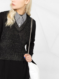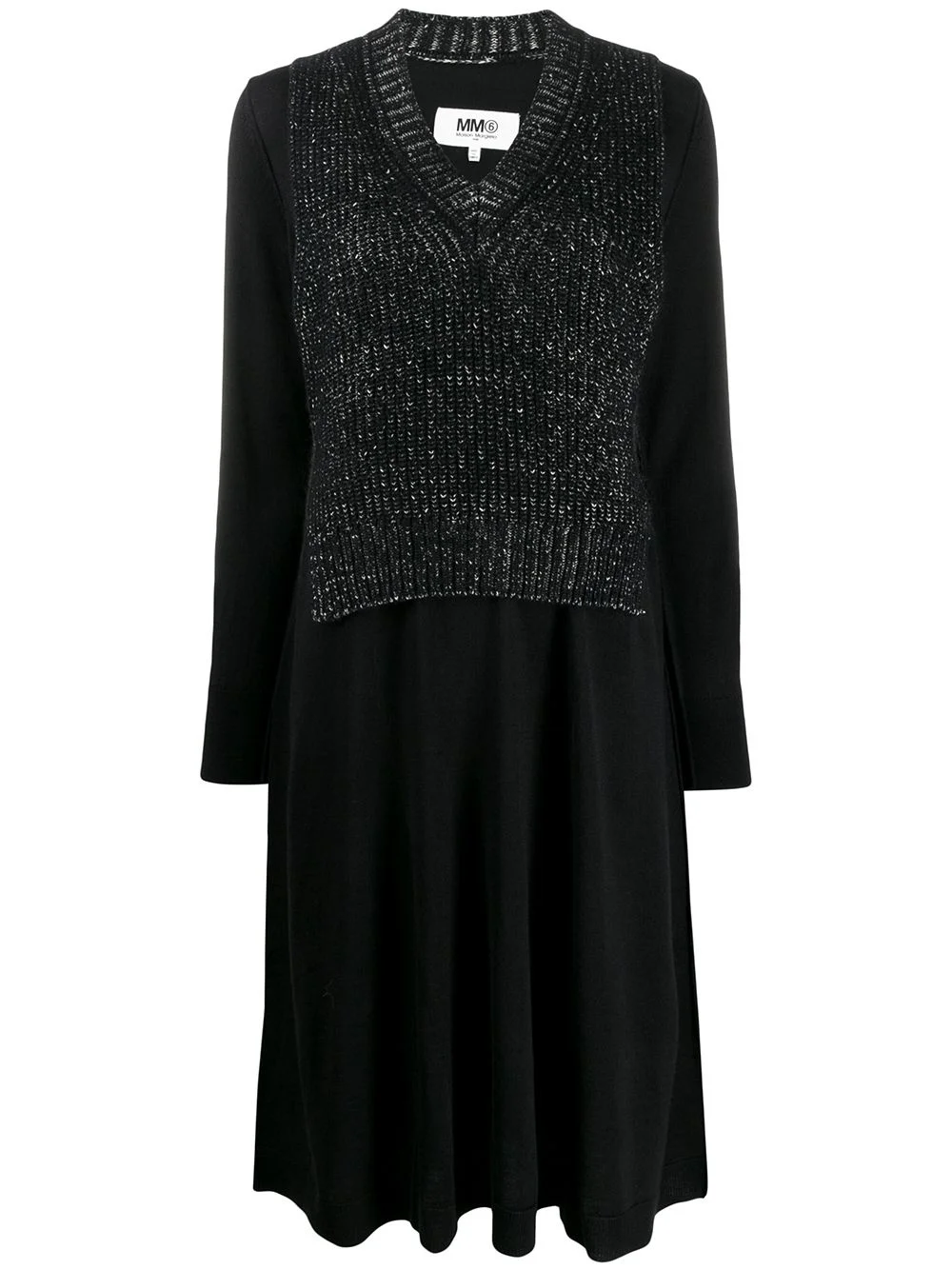 Spliced bib panel dress When you've got a dinner party at 7 pm but you want to have a nap on the way, look to this wool-blend knitted dress from MM6 Maison Margiela. Flowing to a knee-length, the floaty shift-style dress is layered with a knitted chest panel with a back tie fastening. Sometimes warmth takes priority. Featuring a ribbed v-neck, long sleeves, ribbed cuffs, silver-tone metallic threading and a knee length. Imported Composition Acrylic 40%, Wool 27%, Cotton 13%, Polyamide 10%, Mohair 10% SIZE & FIT Model measurements Height 5 ft 10 in(1.78 m) Bust/Chest 32.28 in(82 cm) Hips 35.03 in(89 cm) Waist 23.22 in(59 cm) FittingInformation This piece fits true to size. We recommend you get your regular size Designed for a loose fit with a close fit at the waist Made with a mid-weight fabric Washing instructions Dry Clean Only