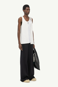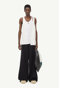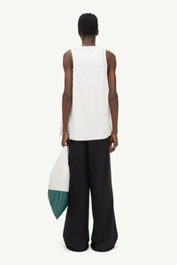 Sleeveless top cut from heavy rib and basic jersey. Offers the appearance of a spliced garment down the centre. An asymmetric hemline confirms the deconstructed appeal of the design. MM6’s discreet yet distinct signature, a white rectangular stitch line, is found on the back of the top. Model is 187cm tall and wears size S.