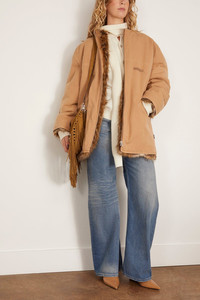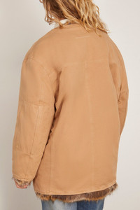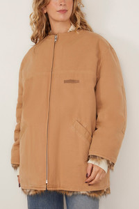 The MM6 Maison Margiela Sports Jacket in Ocre is a tan cotton canvas coat with fur lining. Features a front zip closure, collarless design, and welt pockets.