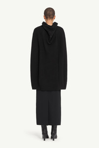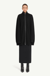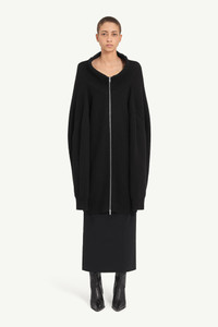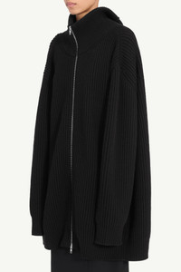 A ribbed knit cardigan with a high neck and exaggerated proportions. Designed with a two-way zip and elongated sleeves, it features a vertical panel inserted at the back to expand the silhouette. Ready-when-worn, with or without the panel open. Finished with the MM6 white stitch line at the back. Product Details Item ID S62AN0158M13192900 Primary fabric: 61% Wool Secondary fabric: 20% Viscose Tertiary fabric: 18% Polyamide Elastane: 1% Ribbed knit cardigan dress in wool blend High stand collar Two-way zip fastening Dropped shoulders and extended sleeves White stitch line at the back Made in Italy Model is 180 cm tall and wears a size M.
