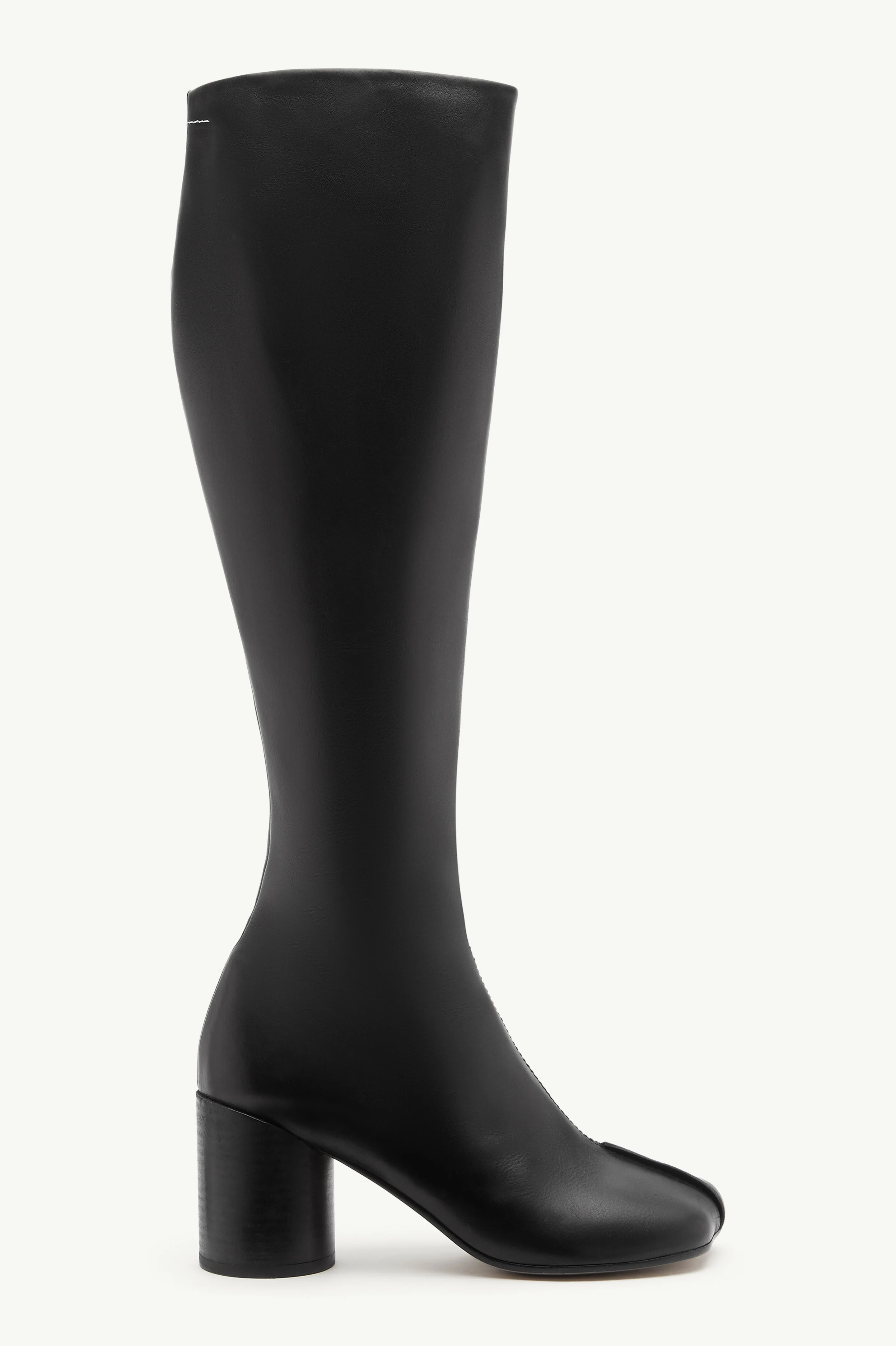 Slip on knee-high boots made from shiny leather with an anatomic toe and cylindrical heel. They hide a discreet zip closure on the inside of the style and are detailed by the brand's new stitch-out technique. MM6's discreet yet distinct signature, a horizontal white stitch line, is present on the back of the shoes. Product Details Item ID S59WW0110P5000T8013 Upper: 100% calf leather Lining: 100% calf leather Inside: 100% ovine leather Sole: 100% calf leather Heel height: 7 cm/2,8 in Boots in shiny vegetable leather Knee-height MM6 anatomic shape Cylindrical heel Zip closure on the inside White stitch line at the back Made in Spain