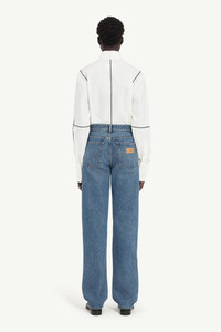 These straight-leg jeans rethink denim architecture by bringing hidden elements to the forefront. The inverted pocket detail and contrast-wash denim panels lend a deconstructed, layered effect. At the back, the Maison's discreet white stitch line and numeric artwork underscores its iconic design signature. Product Details Item ID S52LA0256M30018967 Primary fabric: 100% Cotton Secondary fabric: 65% Polyester, 35% Cotton Straight-leg jeans with two-tone design Visible front button and zip fly closure Traditional five-pocket styling Contrast lighter front pocket fabric Classic denim stitching and seam details Regular hemline with slight break Belt loops on waistband White stitch line at the back Made in Italy Model is 180 cm tall and wears a size 28.