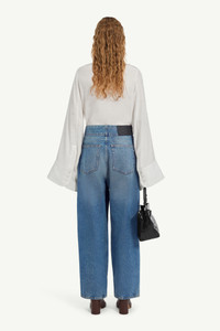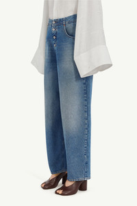 High-rise straight-leg jeans crafted from cotton denim and detailed with contrast tobacco stitching. A buttoned closure and belt loops frame the design, while five-pocket construction reinforces its classic shape. At the back, the MM6 numeric artwork patch and signature white stitch line underscore their identity. Product Details Item ID S52LA0235M30058965 Primary fabric: 100% cotton Pocket lining: 65% polyester 35% cotton Full-length wide-leg fit Button and fly closure at the front White stitch line at the back Made in Italy