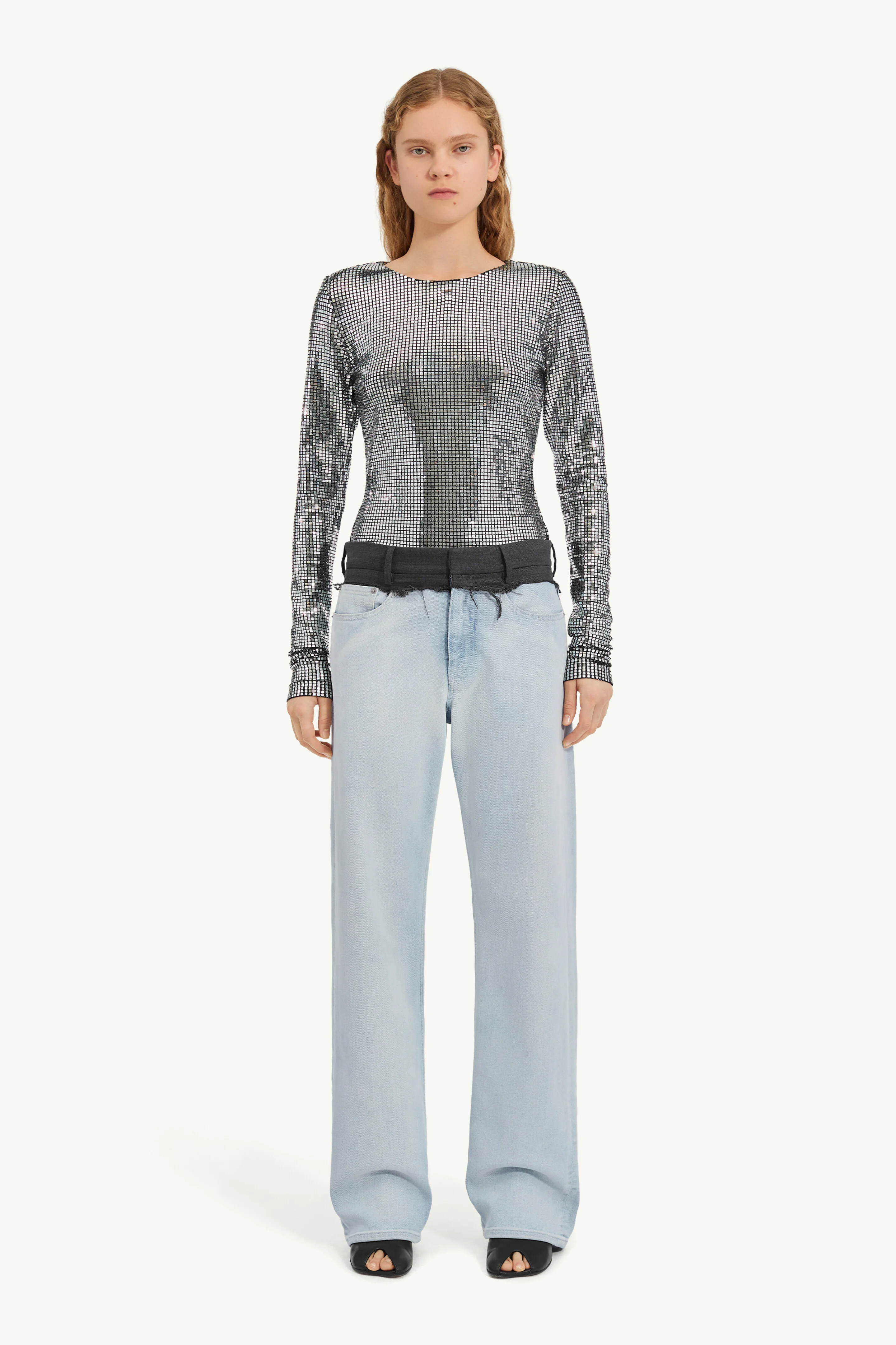 These light-wash denim trousers are redefined with a tailored wool waistband, cut raw for a deconstructed finish. The relaxed straight-leg silhouette contrasts the structured upper, subverting traditional notions of jeans. At the back, the MM6 white stitch line underscores its identity. Product Details Item ID S52LA0270M30056961 Primary fabric: 98% cotton 2% elastane-spandex Pocket lining: 65% polyester 35% cotton Full-length straight-leg Visible contrast waistband detail Zip and button closure at the front White stitch line at the back