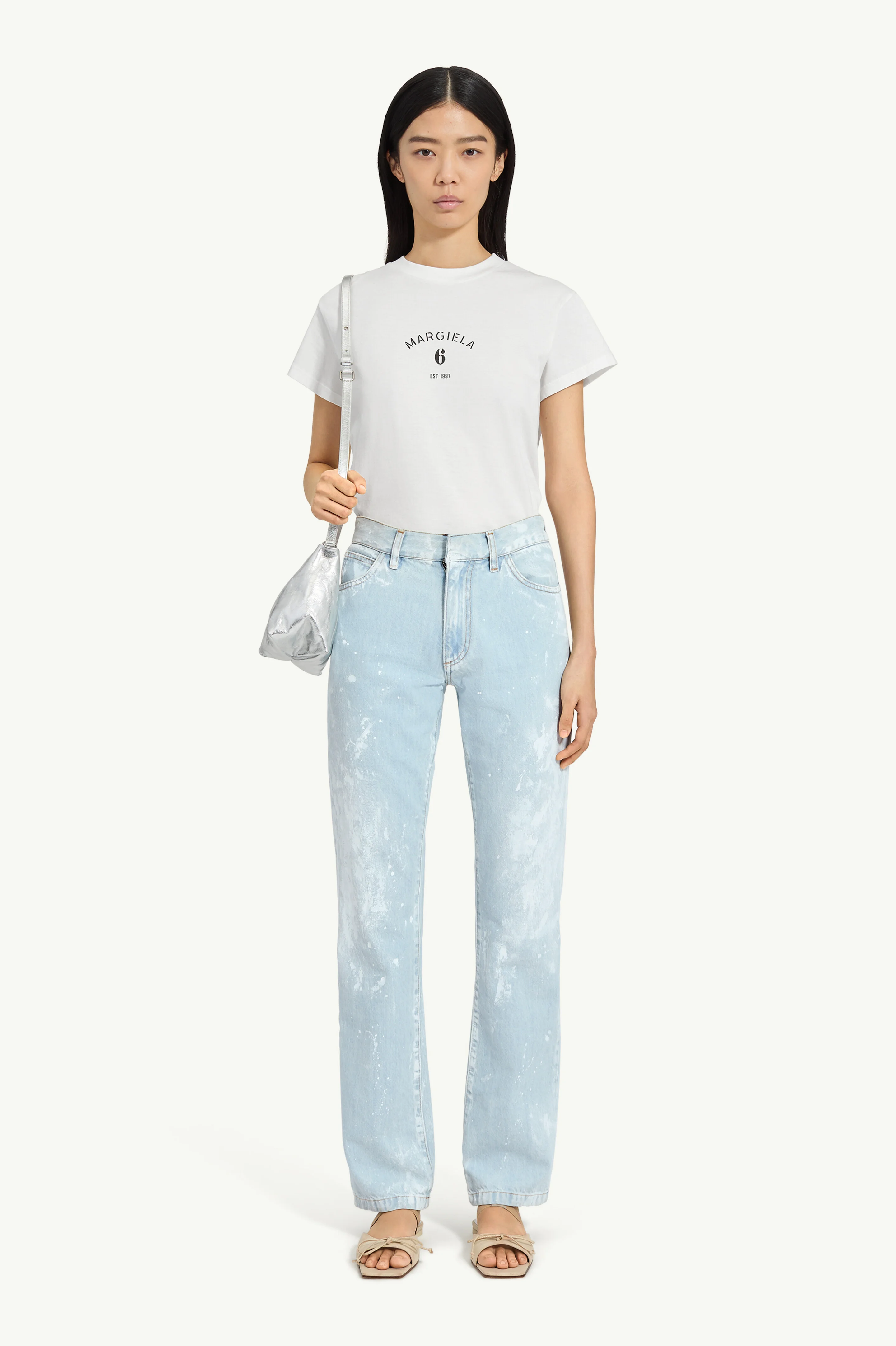 Cut with a straight silhouette, these MM6 jeans are defined by the Maison’s archival paint technique, giving the denim a layered, worn-in appearance. Classic proportions remain intact, allowing the surface treatment to subtly reframe the design. The back pocket is finished with a numeric signature patch. Product Details Item ID S62LB0216M30055966 Primary fabric: 100% cotton Full-length straight-leg Handpainted treatment Zip and button closure at the front White stitch line at the back Made in Italy
