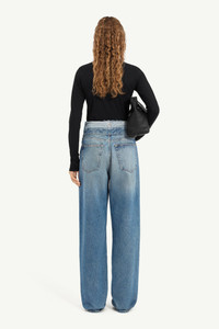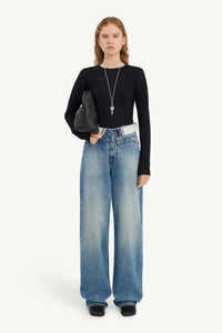 These jeans rework a straight-leg cut with a layered waistband, creating a doubled effect that reveals raw edges and inner construction. The faded wash and tobacco yarn stitching adds a lived-in character, while the unexpected tailoring detail underscores MM6’s subversive approach to denim. At the back, the white stitch line asserts its signature. Product Details Item ID S52LA0271M30058965 Primary fabric: 100% cotton Pocket lining: 65% polyester 35% cotton Full-length wide-leg fit Distressed double waistband detail Zip and button closure at the front White stitch line at the back