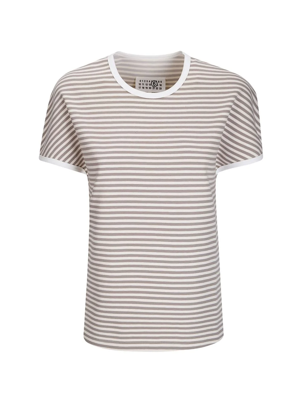 striped T-shirt Highlights - Beige/off-white - Stripe pattern - Round neck - Short sleeves - Contrasting trim Imported Composition Cotton 96%, Spandex/Elastane 4% Washing instructions Read Manufacturer Guidelines