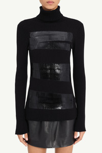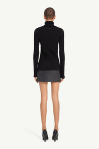 This ribbed knit turtleneck disrupts a classic silhouette with glossy tape-effect markings across the front – an homage to archival garments altered using packaging tape. The high neckline and fitted sleeves enhance its sleek profile. At the back, the horizontal white stitch line asserts MM6’s distinct signature. Product Details Item ID S62HA0095M13196900S Primary fabric: 80% Wool, 20% Polyamide Ribbed knit turtleneck with tape-effect Long sleeves and fitted silhouette Rolled high neckline White stitch line at the back Made in Italy Model is 180 cm tall and wears a size M.