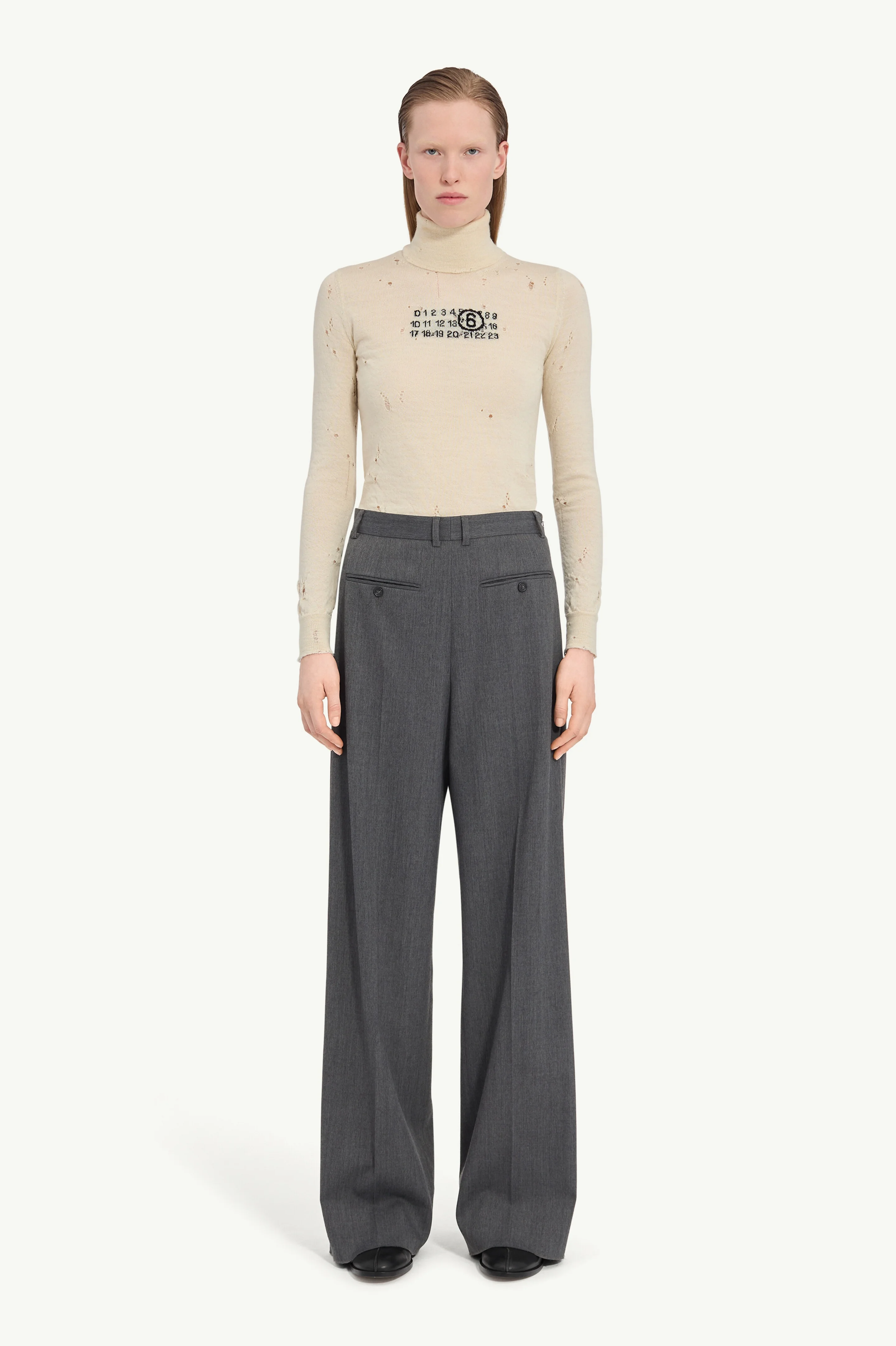 Two halves, one whole. These trousers reconstruct the familiar by merging two backs into a single garment, challenging the conventions of tailoring. Their exaggerated proportions amplify volume, while welt pockets sit where front-facing details would traditionally be. At the back, they are signed with the MM6 white stitch line. Product Details Item ID S52KA0538S47848860M Primary Fabric: 54% Polyester 44% Virgin Wool 2% Elastane-Spandex Pocket Lining: 100% Viscose-Rayon Tailored trousers in wool blend Inverted construction with belt loops Buttoned welt pockets at the front Side zip closure Extra-long wide-leg silhouette White stitch line at the back Made in Italy Model is 180 cm tall and wears a size 42.