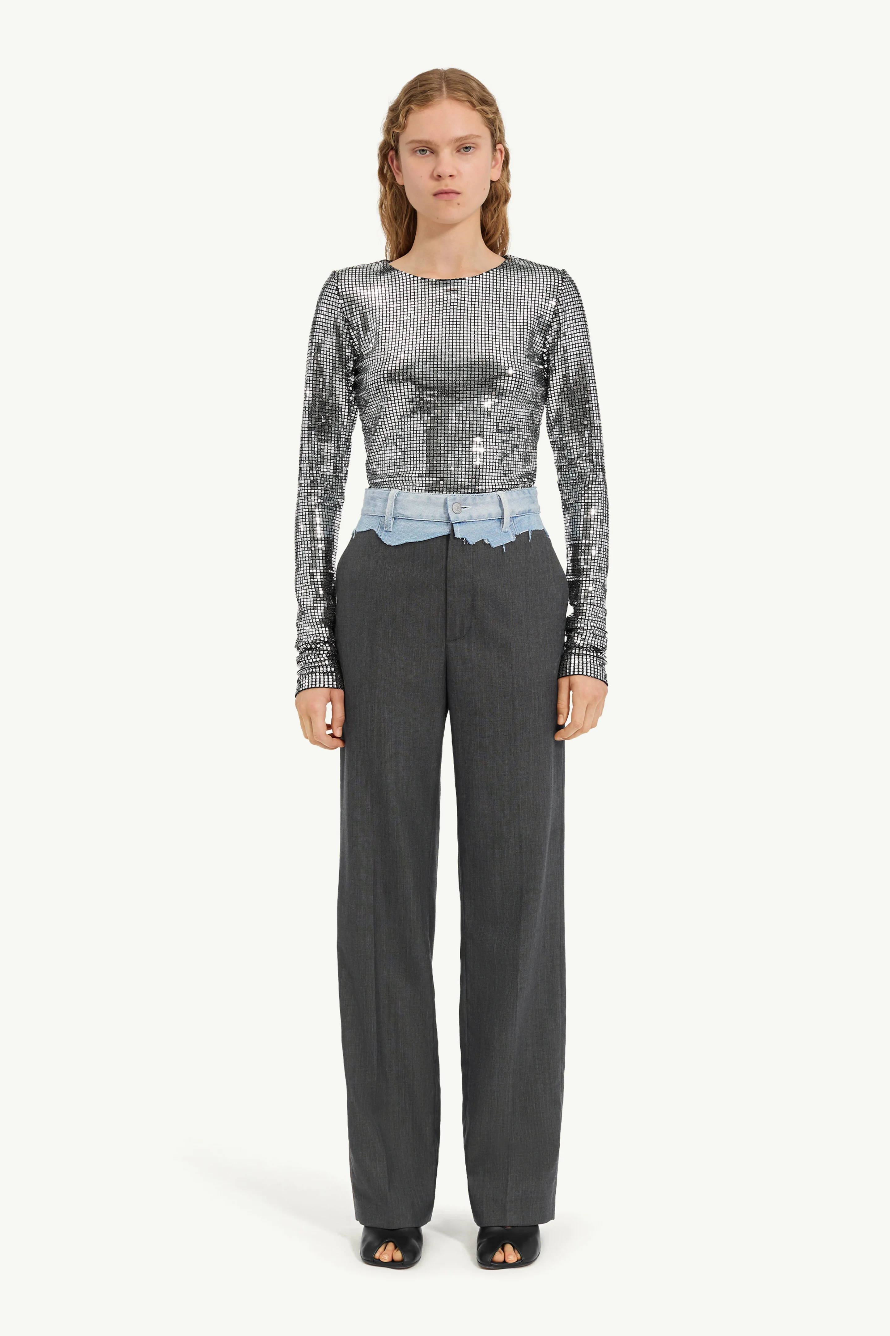 Cut from a light wool blend, these trousers balance precision tailoring with deconstruction. The clean lines of the straight-leg cut are disrupted by a raw denim waistband, stitched on with unfinished edges for an intentionally spliced effect. Finished with the MM6 white stitch line at the back. Product Details Item ID S52KA0557MTN132961 Primary fabric: 60% virgin wool 40% cotton Secondary fabric: 93% cotton 5% polyester 2% elastane-spandex Pocket lining: 100% viscose-rayon Full-length wide-leg fit Denim-effect waistband detail Center zipper and button closure White stitch line at the back Made in Italy