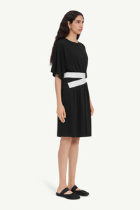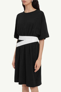 This jersey mini dress disrupts traditional shapes with its uniquely snatched waist, creatively taped for unexpected yet flattering proportions. The crewneck and short sleeves provide a timeless base, while the white stitch line at the back reflects MM6’s commitment to deconstructive design. Product Details Item ID S52DA0063M20048900 Primary fabric: 100% cotton Cotton jersey mini dress Crewneck Short sleeves Snatched waist Tape-like application on waist White stitch line at the back Made in Italy