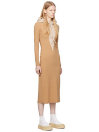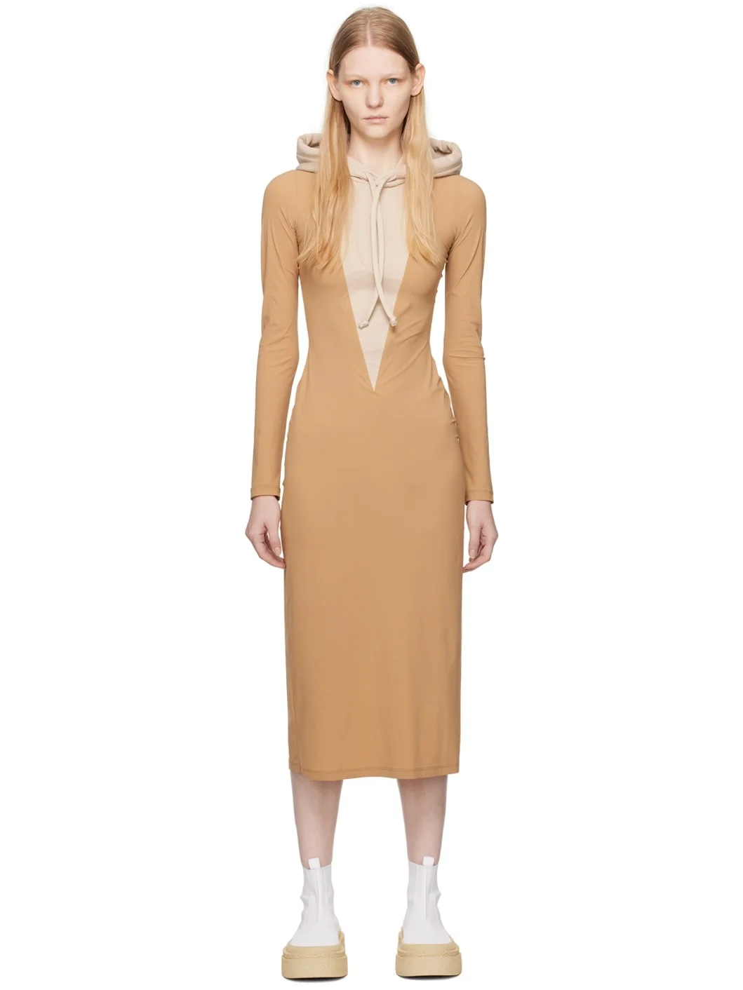 Stretch nylon jersey and cotton-blend jersey dress. · Paneled construction · Drawstring at hood · White stitching at back collar · Central vent at back hem · Unlined Supplier color: Camel/Beige