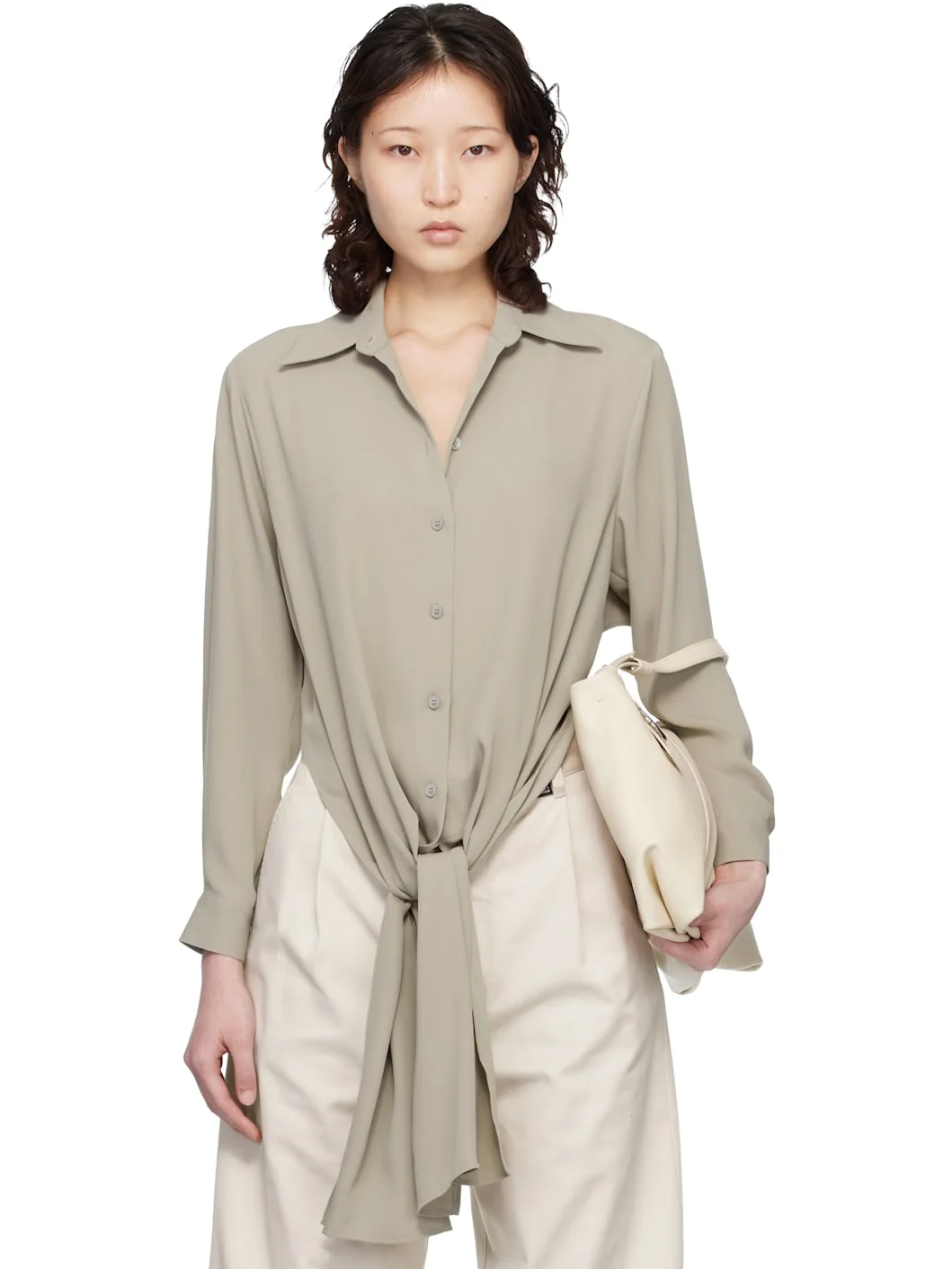 Chiffon shirt. · Spread collar · Button closure · Self-tie fastening at front hem · Barrel cuffs · White stitching at back yoke · Open back Supplier color: Dune 100% polyester. Made in Italy 261188F109008