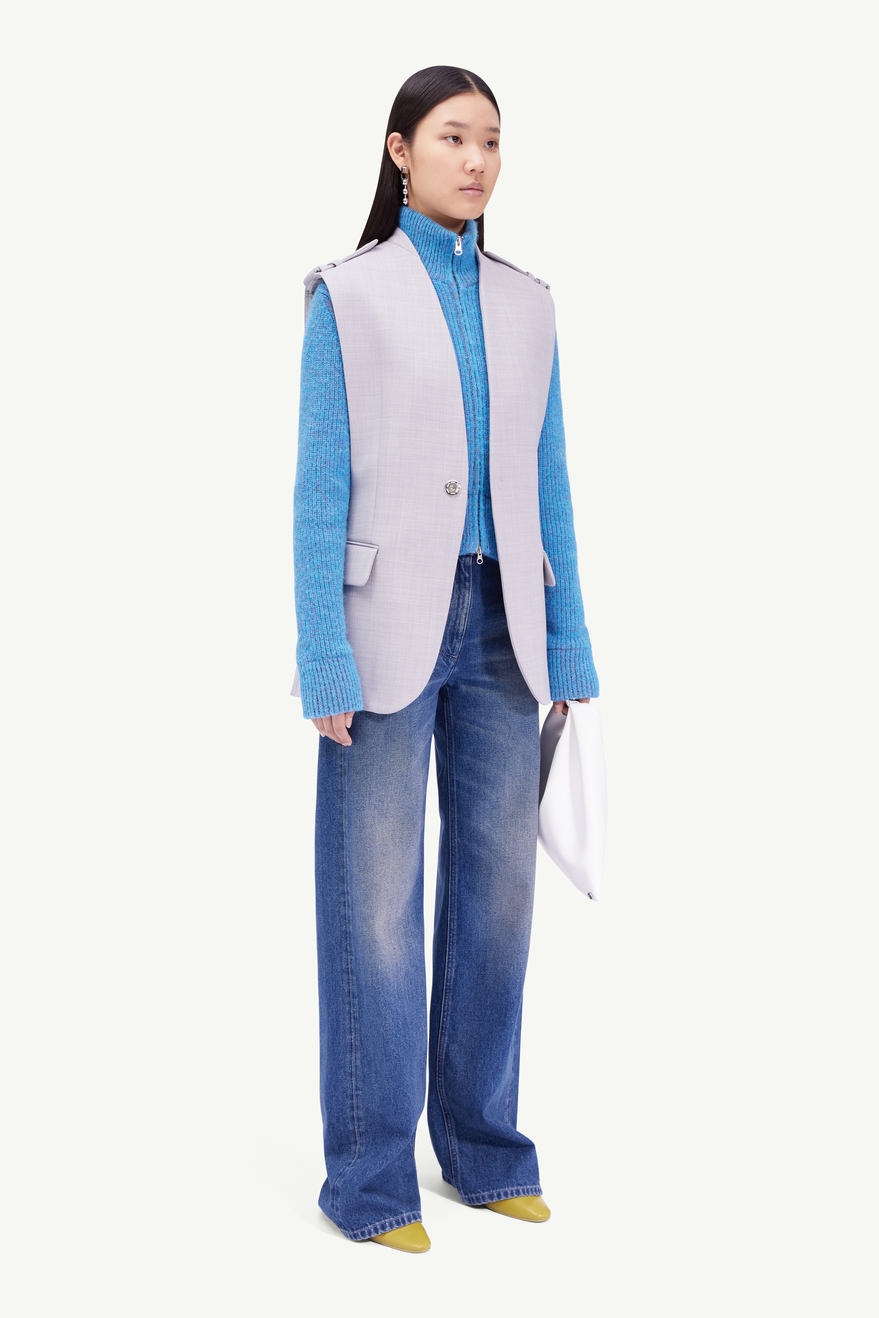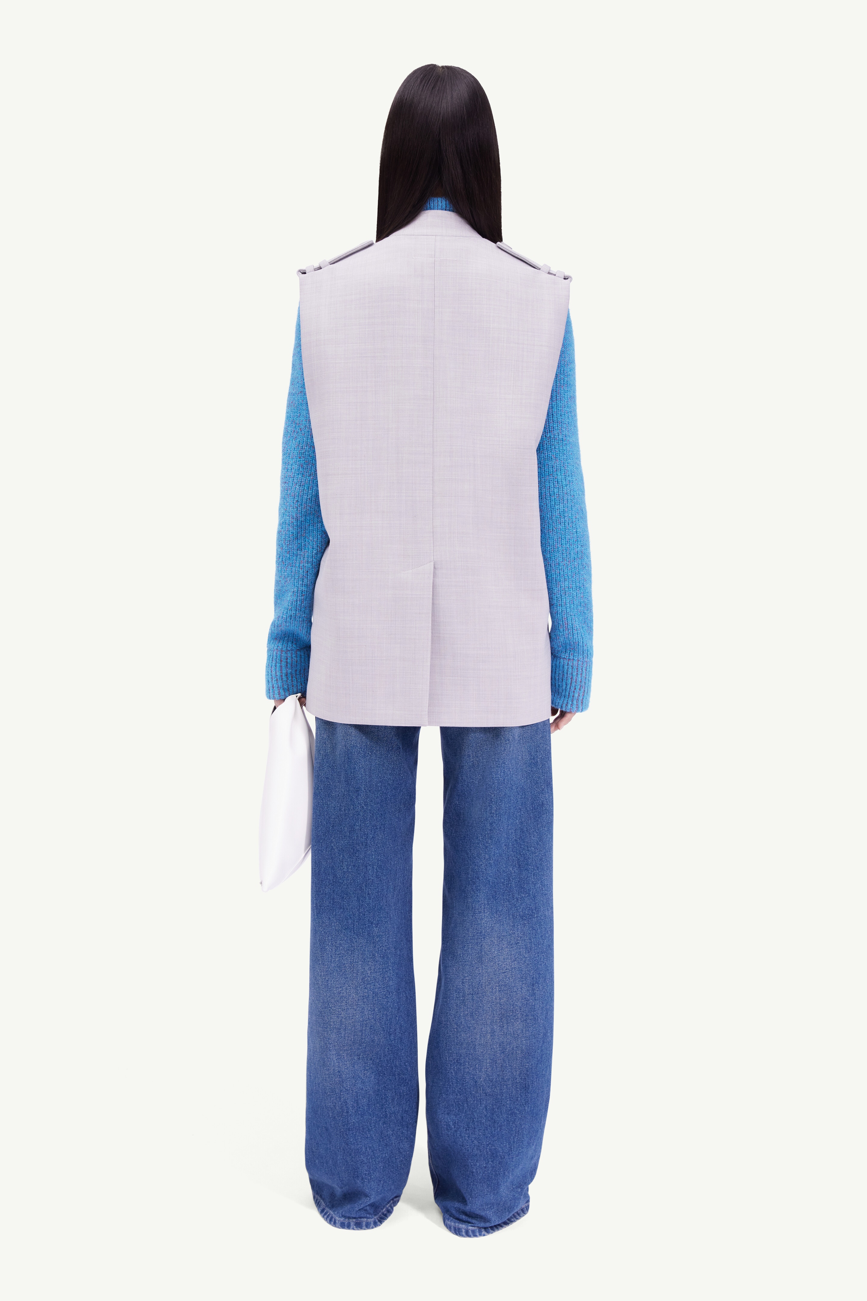 Tailored gilet in techno wool for a new approach, featuring military-inspired epaulets, a back vent and flap pockets. The arm holes are deliberately long creating an off-kilter effect. MM6’s discreet yet distinct signature, a horizontal line of white stitches, is found on the back of the garment. Product Details Item ID S52FB0065S47850856M Details Composition: 54% Polyester 44% Virgin Wool 2% Spandex - Lining: 100% Viscose