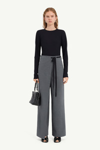 Tailored in a wool blend, these wide-leg trousers feature an attached side panel detailed with jacquard label motifs and tonal laces. The panel can be worn tied for a wrapped silhouette or left untied for a fluid, deconstructed effect. At the back, the MM6 white stitch line affirms its signature. Product Details Item ID S52KA0518M35733860M Primary fabric: 54% polyester 44% wool 2% elastane-spandex Pocket lining: 100% viscose-rayon Full-length wide-leg fit Overlay front panel with tie detail Front tie and concealed closure White stitch line at the back Made in Italy