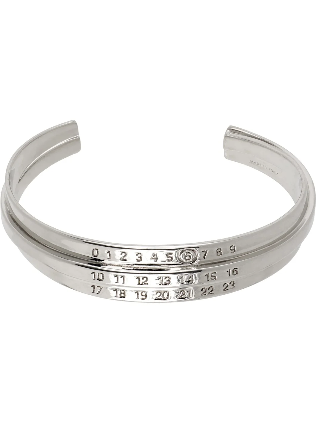 Open cuff bracelet in silver-tone brass. Logo engraved at face. Supplier color: Palladio buratta Brass. Made in Italy 252188F020004