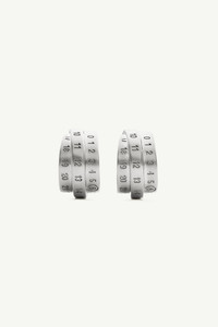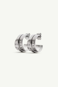 These silver-finished brass earrings, engraved with the MM6 numeric signature, blend minimalist design with a subtle statement. Secured with push-back fastenings, they offer a refined accessory that speaks to the Maison’s modern aesthetic. Product Details Item ID SM6VG0083P6627955 Body: 100% brass Brass earrings Push-back fastening Engraved MM6 numeric signature Made in Italy The item comes in a white zipped bag