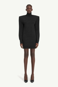 This wool-blend mini dress channels MM6’s irreverent approach through sharp, archive-inspired tailoring. A reworked shoulder piece from the Maison’s archive creates a pronounced V-silhouette, defined by a structured funnel neck and angular shoulders. Ready-when-worn, with or without its built-in structure. At the back, the MM6 white stitch line asserts its signature. Product Details Item ID S62DA0052M13188855 Primary fabric: 50% Polyester, 50% Virgin Wool Long-sleeved mini dress in a wool blend High funnel neck White stitch line at the back Made in Italy Model is 179 cm tall and wears a size M.