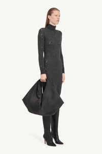MM6 deconstructs knitwear conventions with this distressed turtleneck dress. Artful abrasions punctuate the soft knit, adding texture and depth, while the elongated, form-fitting silhouette enhances its refined edge. The signature white stitch line at the back completes the piece with an unmistakable MM6 touch. Product Details Item ID S52DD0073M13134855 Primary fabric: 100% Virgin Wool Midi dress with distressed detailing High neck turtleneck Long sleeves with cuffs Straight hemline, ribbed edge Centre back seam, scattered small holes White stitch line at the back Made in Italy Model is 180 cm tall and wears a size M.