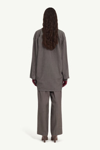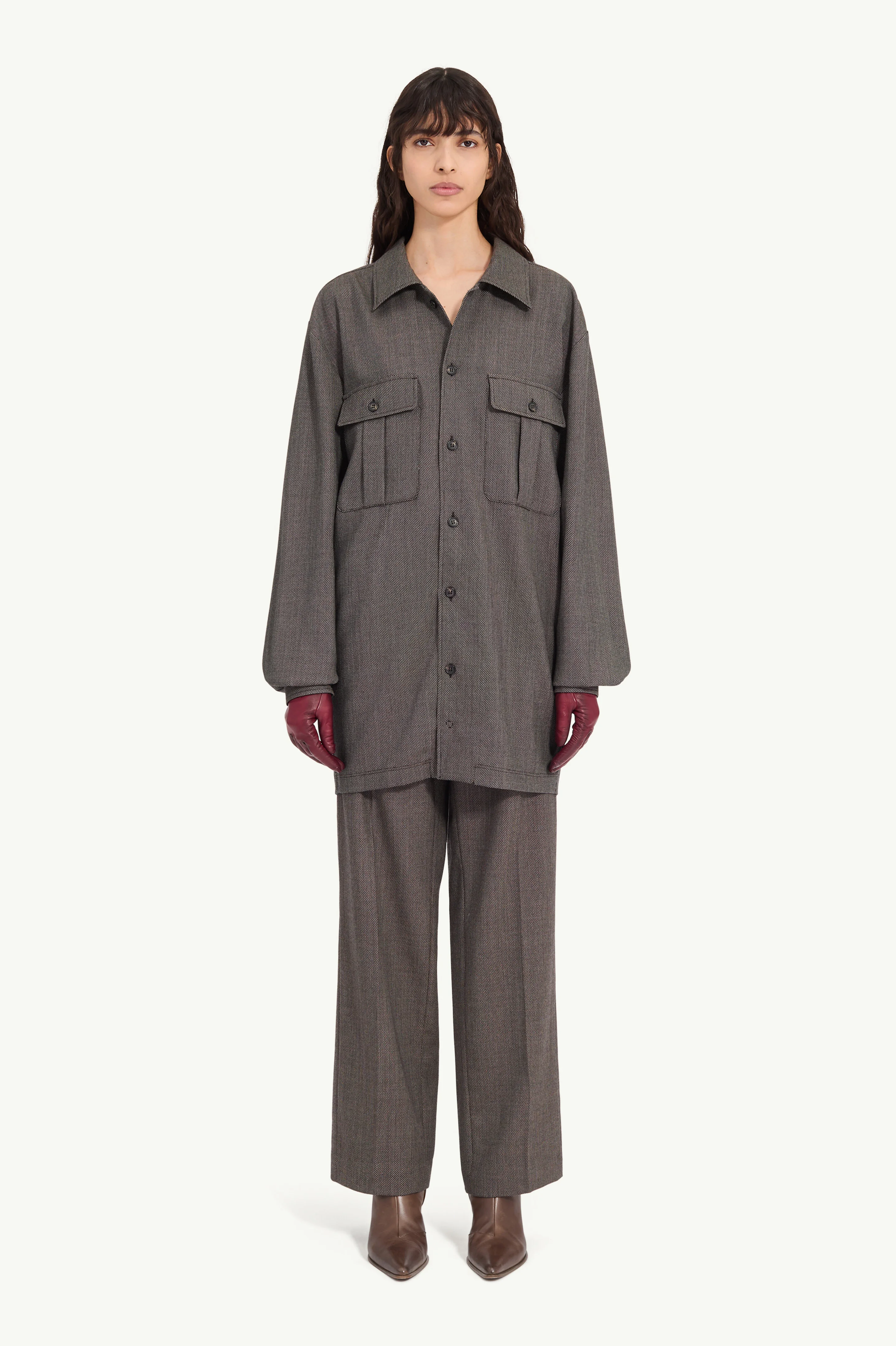 Cut in classic tweed, this shirt dress adopts the attitude of workwear with flap patch pockets and buttoned cuffs. Its elongated shape speaks to MM6’s subversive spirit and archival menswear influences. At the back, the MM6 white stitch line underscores its signature. Product Details Item ID S62DA0064M35636001F Primary fabric: 100% Virgin Wool Secondary fabric: 100% Cotton Longline shirt dress in tweed Button front fastening and pointed collar Patch flap pockets at the chest Buttoned cuffs and long sleeves White stitch line at the back Made in Italy Model 1 is 179 cm tall, model 2 is 178 cm tall and wears a size 42.