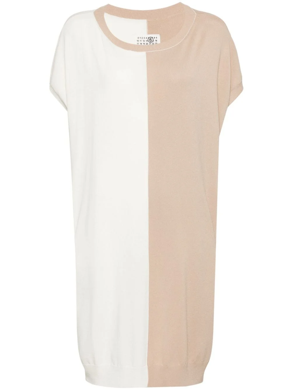 two-tone knitted dress Highlights - Beige/off-white - Fine knit - Two-tone design - Crew neck - Drop shoulder - Short sleeves - Ribbed trim - Straight hem - Knee-length Made in Italy Composition Viscose 88%, Polyester 12% SIZE & FIT Model measurements Height 5 ft 9 in(1.75 m) Bust/Chest 31.88 in(81 cm) Hips 35.03 in(89 cm) Waist 23.22 in(59 cm) FittingInformation Designed to be unstructured, offering a loose fit throughout Made with a lightweight knit, this piece offers some stretch This piece fits true to size – take your usual size