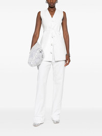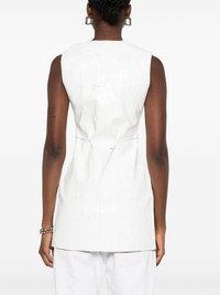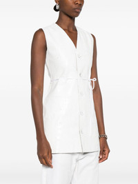 v-neck gilet Highlights - White - Sleeveless - Front button fastening - Adjustable and detachable tie fastening - V-neck Made in Italy Composition Outer: Polyester 54%, Virgin Wool 44%, Elastane 2% Lining: Viscose 100% SIZE & FIT Model measurements Height 5 ft 10 in(1.78 m) Bust/Chest 31.49 in(80 cm) Hips 37 in(94 cm) Waist 23.62 in(60 cm) FittingInformation Designed for a slim fit that sits just away from the body offering a close yet comfortable fit The tie fastening gives an adaptable and personalised fit Made from a midweight fabric Washing instructions Do Not Wash/Do Not Dry Clean