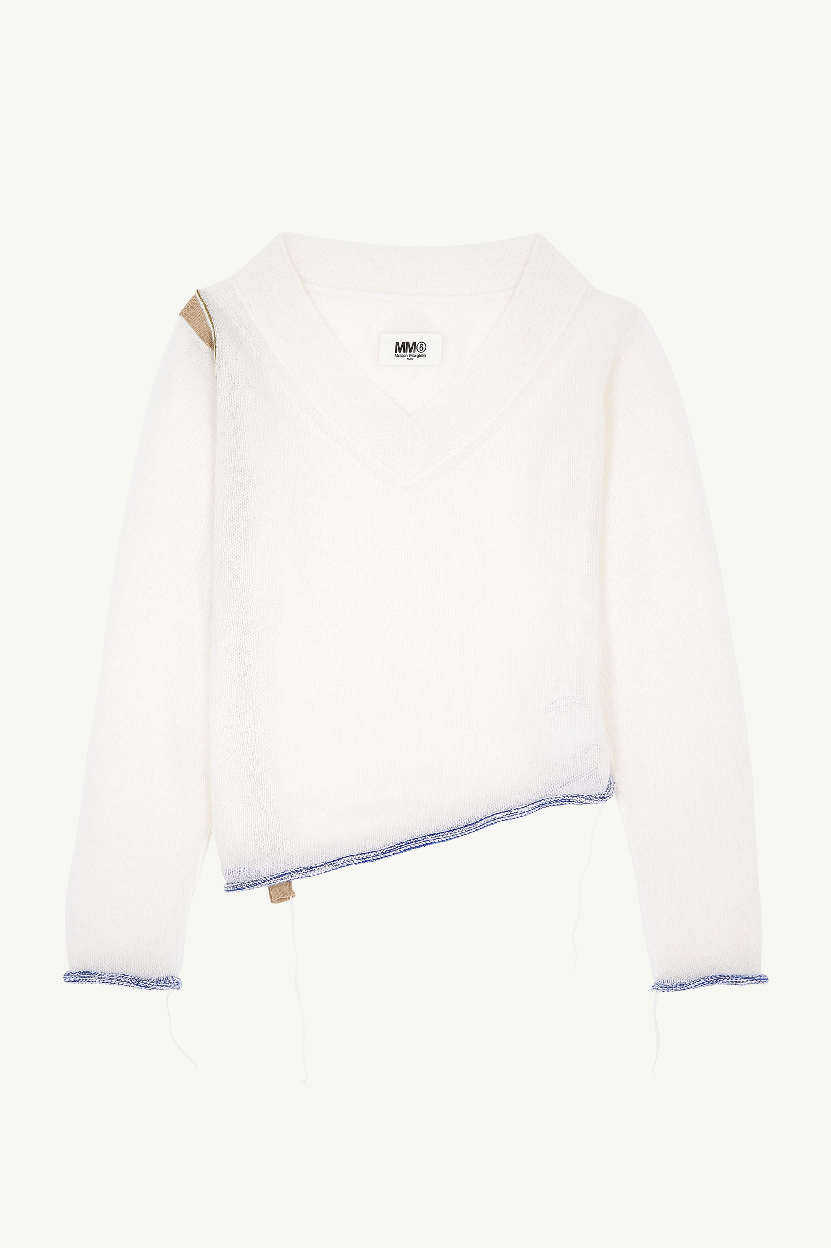 Jumper made of light mohair knit. Presents an asymmetric hemline with tubular edging. A thin contrast panel is inserted down the design's right side. A wide ribbed detailing at the collar adds a structured finish to the design. Gauge 5. Product Details Item ID S52HN0002S18295100 Composition: 37% acrylic, 27% polyamide, 14% wool, 14% mohair, 8% cotton Light knitted top Gauge 5 Ribbed V-neck Asymmetrical bottom White stitch line at the back Made in Italy Model is 5'11" tall and wears a size S.