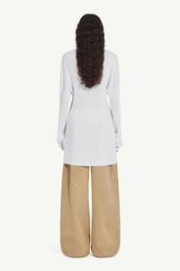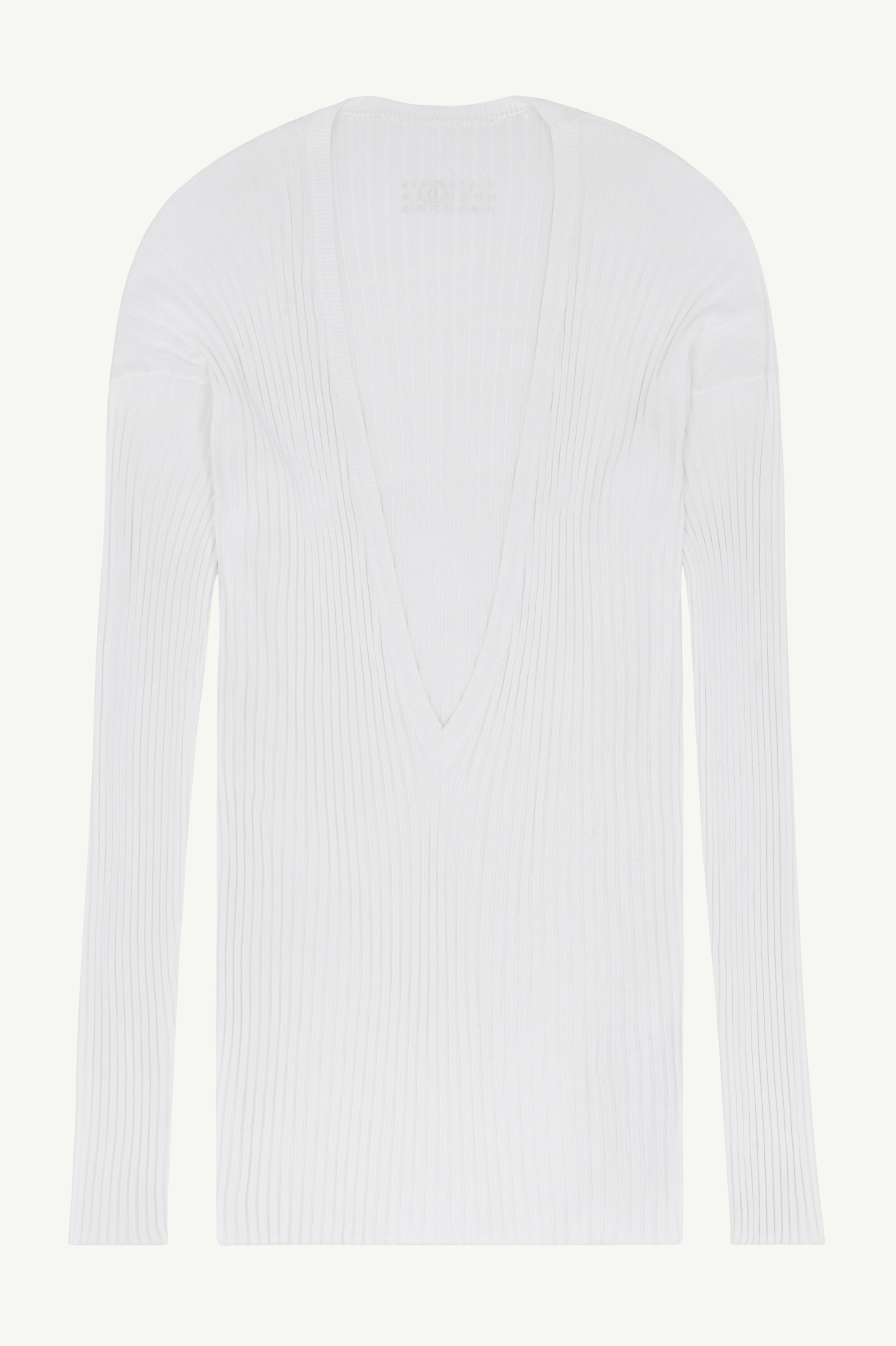 An oversized V-neck that distils familiar knit codes into something quietly subversive. Ribbed detailing introduces texture and depth, while MM6’s numeric artwork at the back signals the Maison’s identity. Product Details Item ID S62DA0050M13125102