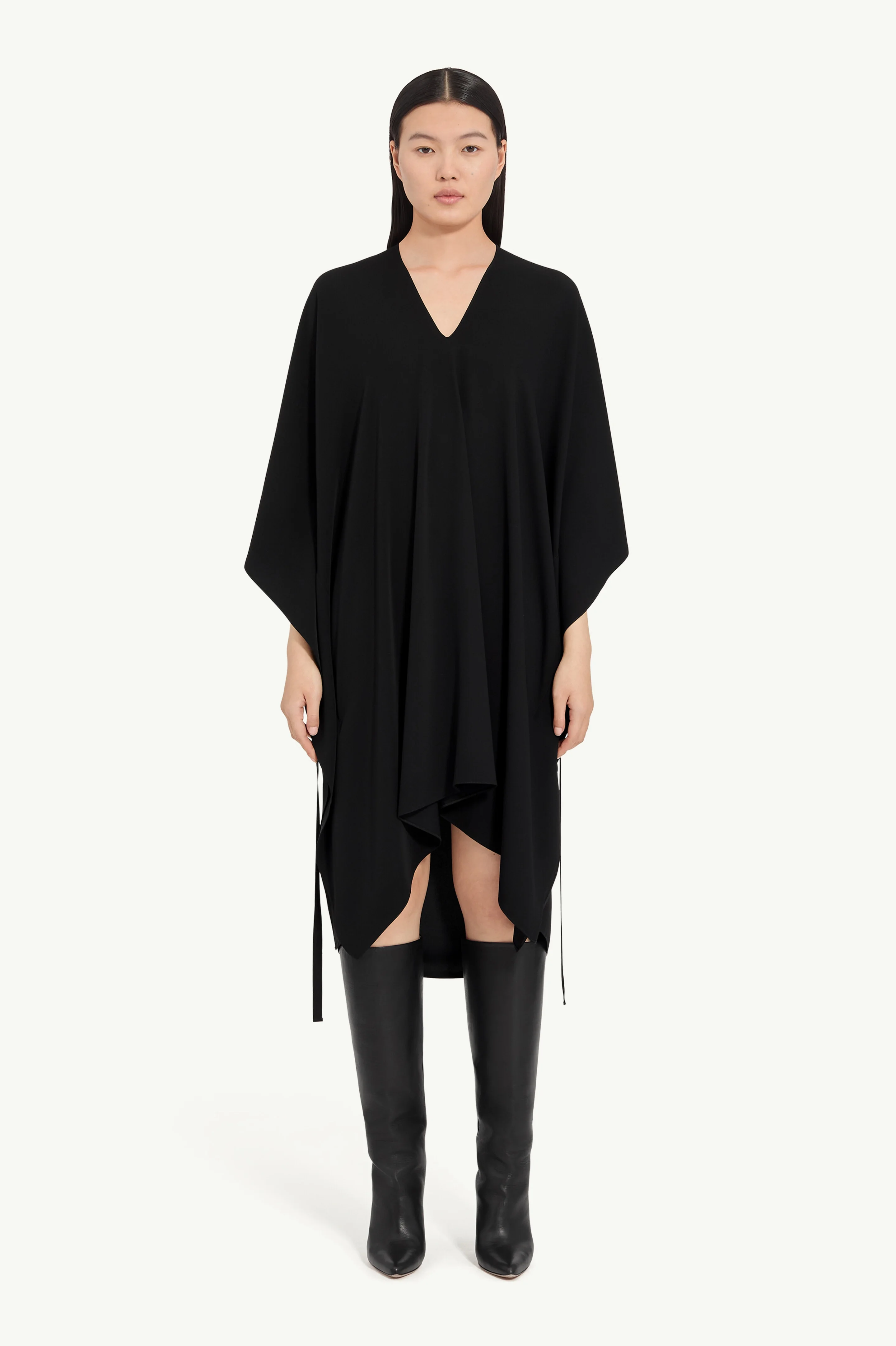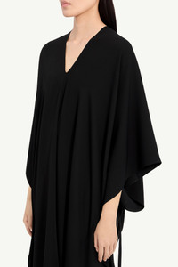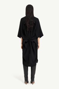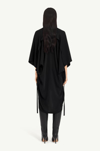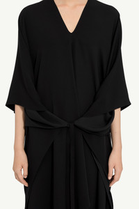 Defined by an interplay of fluidity and precision, this dress is cut with clean, geometric lines and wide kimono-style sleeves. Its adaptable design allows for versatile styling – tied at the front for a sculptural cinch or at the back for an airy, undone elegance. The white stitch line at the back serves as an emblem of MM6’s minimalist codes, reinforcing its refined yet deconstructed aesthetic. Product Details Item ID S52DD0069S43455900 Primary fabric: 100% Polyester Midi dress with a cape-like silhouette V-neck with a central pleat detail Wide, flowing sleeves to elbow length Draped sides with drawstring ties Asymmetrical hemline with pointed edges Seam detailing throughout White stitch line at the back Made in Italy Model is 179 cm tall and wears a size 42.