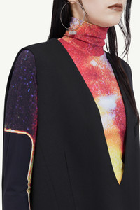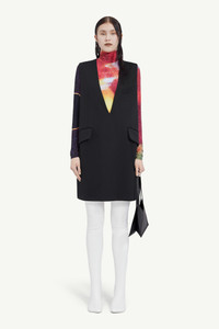 Short dress cut from tailoring wool. The suit jacket-inspired silhouette has classic tailoring elements including the flat chest pocket and front flap pockets, the classic style is modernised with an accentuated V-neckline. The oversized proportion of the design is a key MM6 element. The discreet yet distinct signature, a horizontal line of white stitches, is found on the back. Product Details Item ID S52DA0016S47848900 Composition: 54% polyester, 44% virgin wool, 2% elastane Lining: 100% viscose-rayon Sleeveless dress in tailoring wool Over-the-knee length Deep V-neck Welt chest pocket Flap pockets White stitch line at the back Made in Italy Model is 5'11" tall and wears a size 40.
