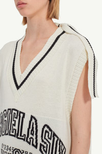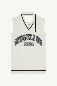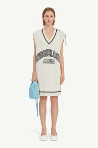 Drawing inspiration from vintage varsity logos and volumes, this mini dress pays homage to the Maison’s monochromatic palette and iconic vareuse shape. Finished with the recognisable MM6 white stitch line, it channels classic athletic styles with a nod to collegiate sport nostalgia. Product Details Item ID S52DA0060M13085101 Primary fabric: 85% cotton, 15% wool Gauge 5 Varisty jacquard mini dress Ribbed trims V-neck MM6 numeric jacquard signature at the front White stitch line at the back Made in Italy