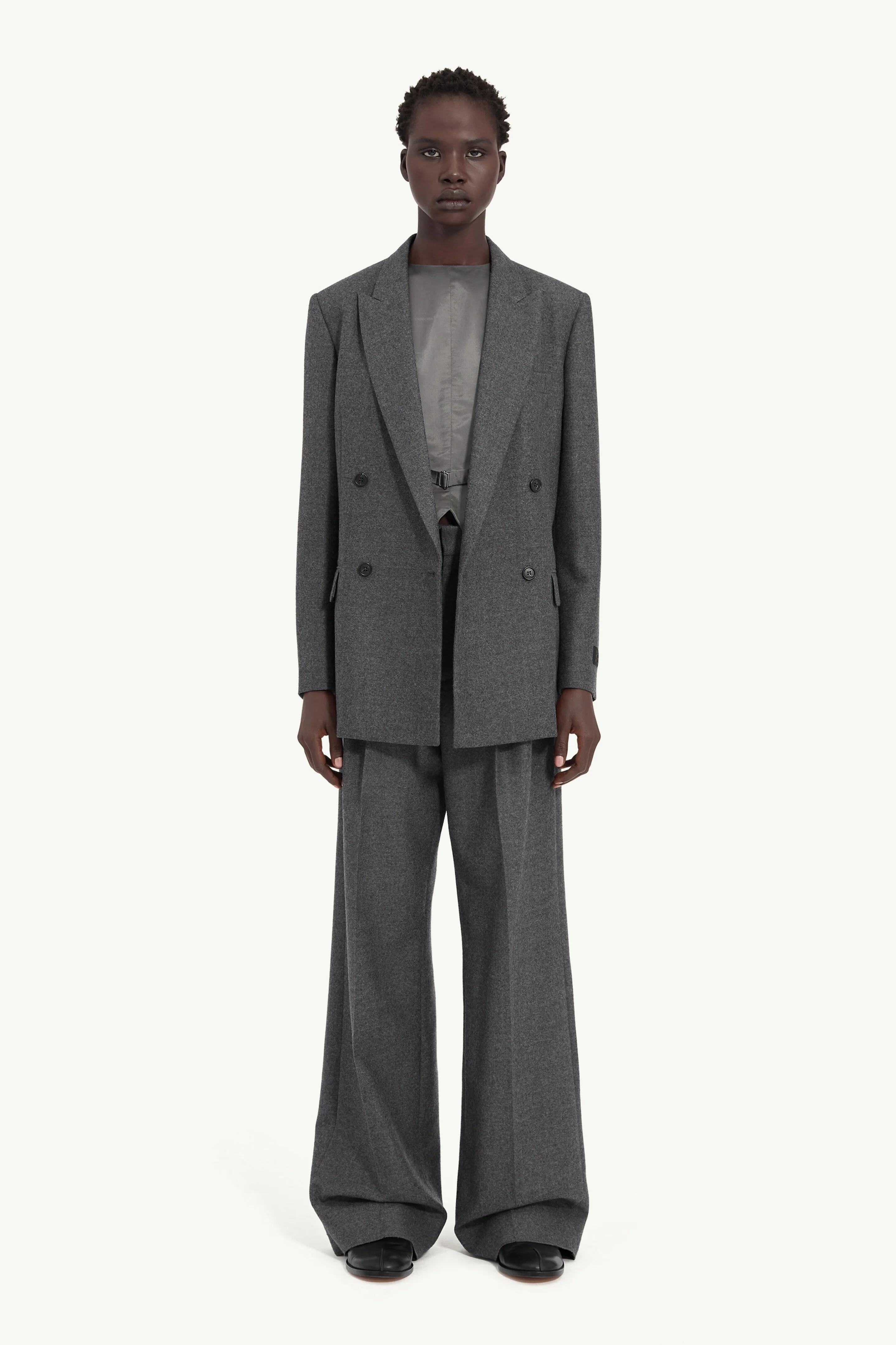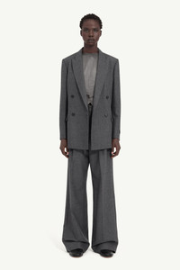 This double-breasted blazer reworks a classic suiting silhouette. The clean lines and oversized shape contrast with subtle disruptions – an embossed MM6 numeric patch at the sleeve and the signature white stitch line at the back, both hallmarks of the Maison’s quiet yet radical approach to tailoring. Product Details Item ID S52BN0144M35466860M Primary fabric: 100% virgin wool Lining: 100% viscose-rayon Double-breasted blazer in structured virgin wool Peak lapels Flap pockets at the front Buttoned cuffs Numeric signature label stitched at the sleeve White stitch line at the back Made in Italy Model is 180 cm tall and wears a size 42.
