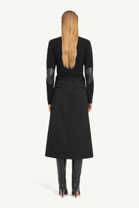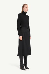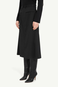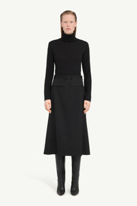 A reconfiguration of the familiar. This tailored midi skirt is built with MM6’s back-to-back construction, fusing traditional suiting elements with a flipped perspective. The front mimics the back, complete with welt pockets and button closures, while the silhouette subtly widens toward the hem. At the back, MM6’s signature white stitch line underscores its identity. Product Details Item ID S52MI0021S47848900 Primary fabric: 54% Polyester, 44% Virgin Wool, 2% Elastane-Spandex Lining: Pocket lining: 100% Viscose-Rayon A-line skirt with mid-length hemline Invisible side zipper closure Belt loops at waist Two back welt pockets with buttons Clean seams with paneling White stitch line at the back Made in Italy Model is 180 cm tall and wears a size 42.