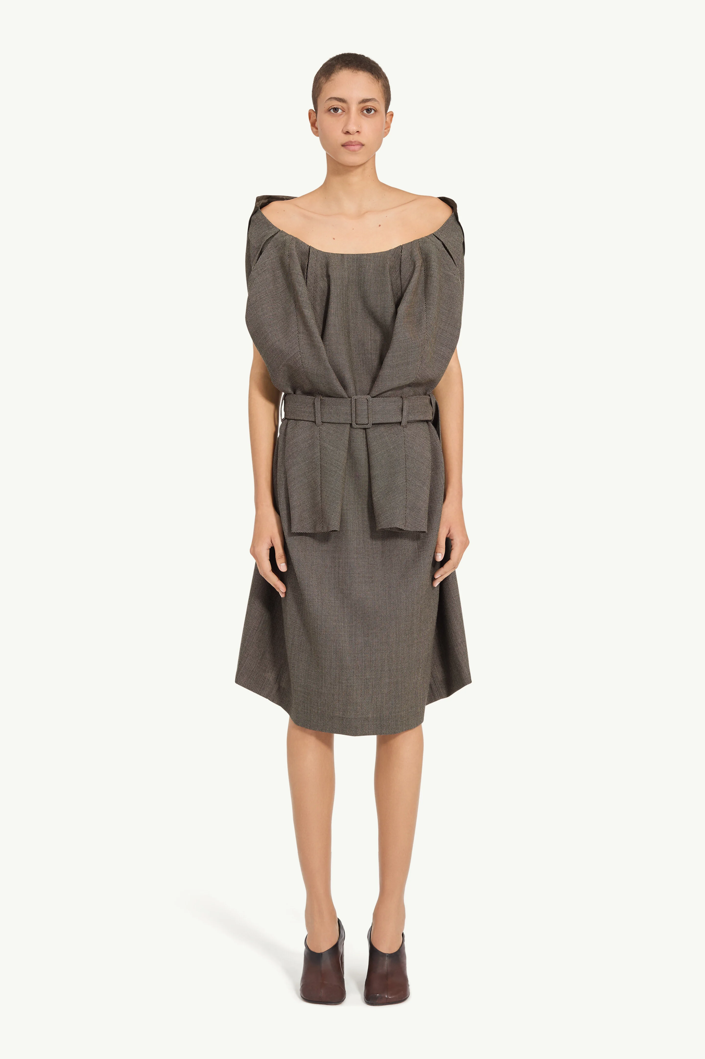 Draped from fine wool twill, this midi dress shapes around the shoulders into a sculptural neckline, cinched by a matching belt at the waist. At the back, a fluid satin panel can be worn expanded or drawn into a narrower form – an open construction that reveals its dual styling. Finished with the MM6 white stitch line. Product Details Item ID S62DD0050M35636001F Primary fabric: 100% Virgin Wool Secondary fabric: 100% Viscose-Rayon Draped wool midi dress Wide bateau neckline Detachable tonal belt Contrast satin back panel White stitch line at the back Made in Italy Model is 180 cm tall and wears a size 42.