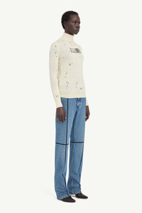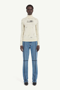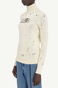 This turtleneck plays with notions of wear and longevity, transforming natural distressing into a design statement. The delicate knit is scattered with intentional abrasions, challenging conventional refinement while remaining effortlessly wearable. MM6’s embroidered numeric artwork and signature white stitch serve as understated hallmarks of the Maison’s experimental approach. Product Details Item ID S52HA0299M13134103 Primary fabric: 100% Virgin Wool Ribbed turtleneck sweater, distressed details High neck turtleneck Long sleeves, ribbed cuffs Ribbed hem, distressed throughout Printed numerical design on chest White stitch line at the back Made in Italy Model is 180 cm tall and wears a size M.